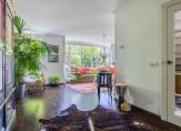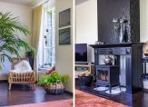 In de woonkamer zorgen de brede erker en grote ramen voor mooi uitzicht naar de voortuin. Het zitgedeelte is bij de houtkachel, en het andere deel van de woonkamer is thans ingedeeld met een grote kast en een zitje bij het raam. Sfeermakers in de woonkamer zijn de parketvloer, de schouw met kachel en de subtiele plafondlijsten.