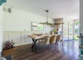 Achter de zwarte deuren met glas is de woonkeuken, met een zitgedeelte aan de tuinzijde en een royaal eetgedeelte vlak naast de keuken. Sfeermakers zijn de parketvloer, de lambrisering bij het eetgedeelte en het optimale uitzicht naar de tuin. In de keuken staat een stijlvolle hoekopstelling in een opvallende kleur, met een grote spoelbak en een zwart composiet aanrechtblad. Het Boretti gasfornuis met ovens is een plaatje en de afzuigkap, vaatwasser, koelkast en vriezer zijn ingebouwd.