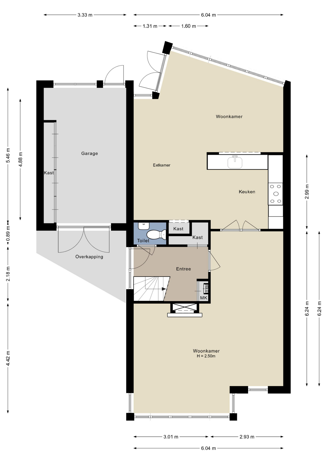 De garage heeft een breedte van 3.33 meter en is bijna 5.50 meter lang. Dubbele deuren geven toegang tot de oprit en er is een deur naar de tuin. Een lange kastenwand biedt volop bergruimte, waardoor de garage al snel een opgeruimde indruk maakt.