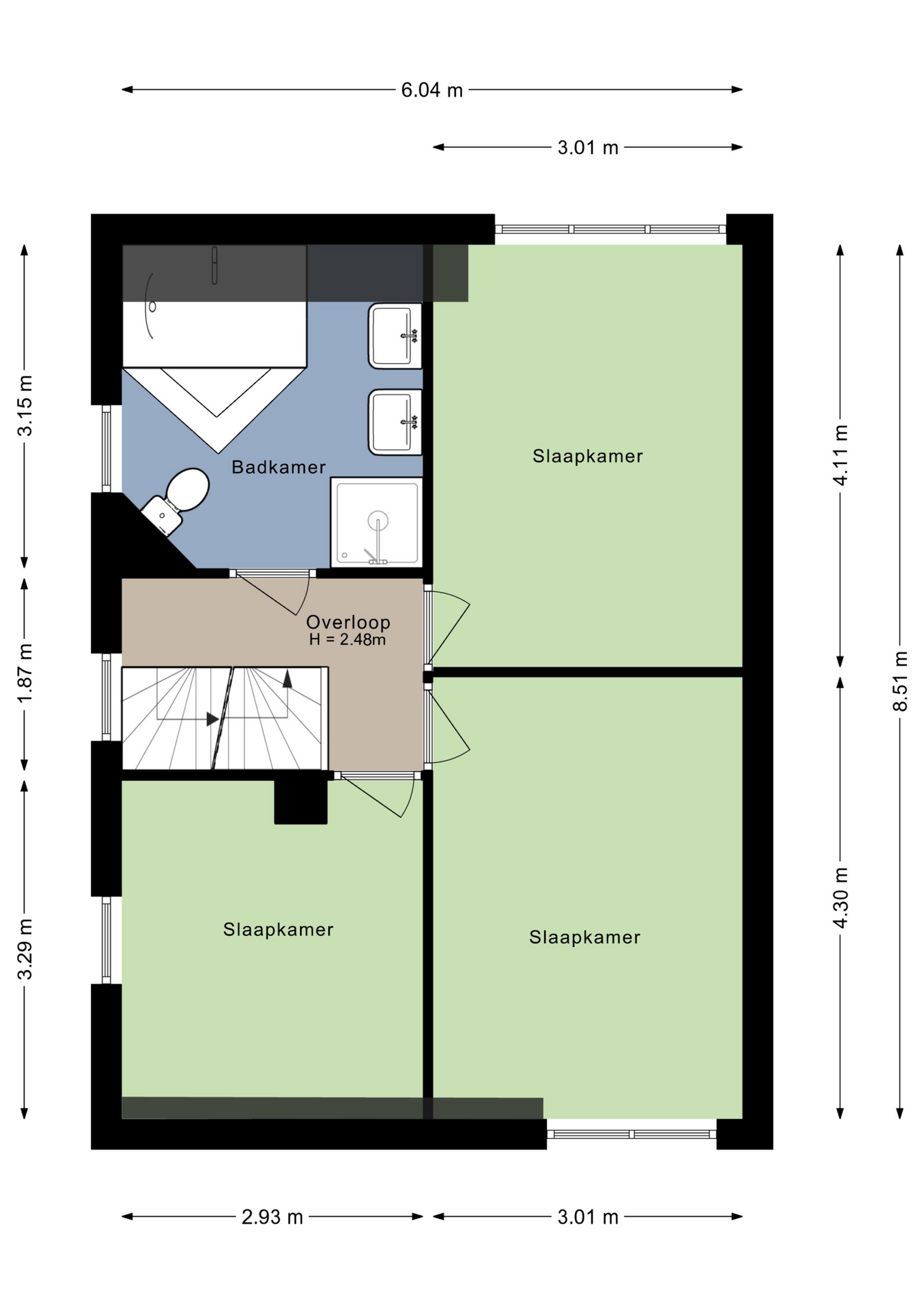 Achter deze deuren zijn drie ruime slaapkamers en de badkamer. Er zijn twee kamers aan de voorzijde, waarvan een met een dakkapel. Ook de slaapkamer aan de achterzijde heeft een dakkapel, voor extra ruimte en lichtinval.
