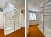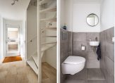 In de hal zie je de lichte, open trap naar de eerste verdieping. De toiletruimte is vernieuwd en de mooie tegelvloer ligt niet alleen in de hal, maar op bijna de hele begane grond. Voor een kapstok en een schoenenrek is er genoeg plek in de hal, onder de trap.