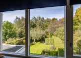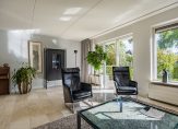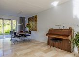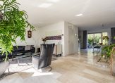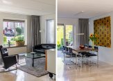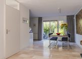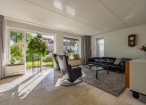 De L-vormige woonkamer is een heerlijk lichte leefruimte, met het zitgedeelte aan de voorzijde en het eetgedeelte aan de achterzijde. Bij het zitgedeelte zie je onder andere ramen tot vloerhoogte, waardoor er mooi uitzicht naar de tuin is. Vanaf het eetgedeelte kijk je naar het grote terras, de tuin en de mooie bomen op de achtergrond.