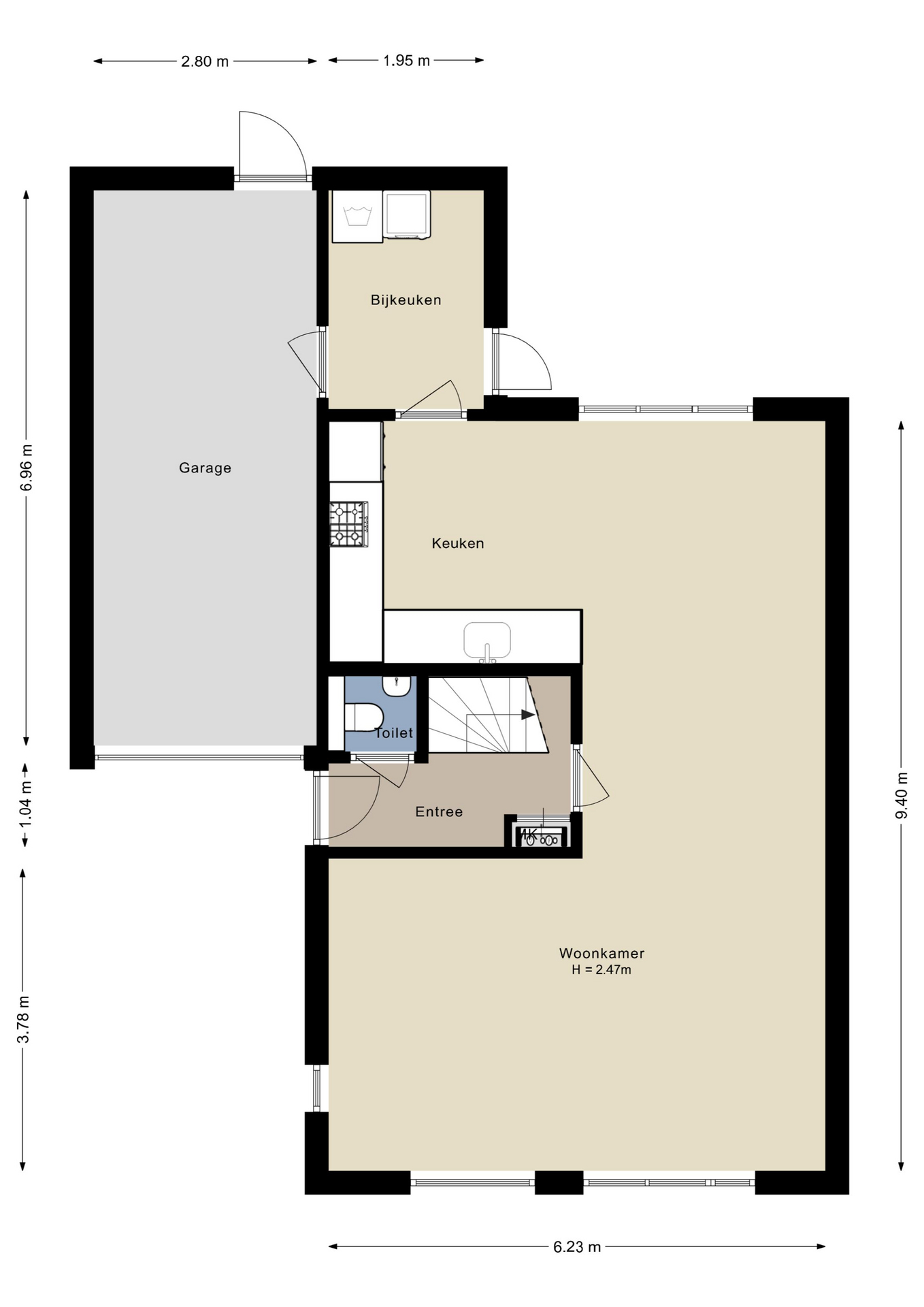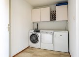 In het verlengde van de keuken is de bijkeuken waar een wasmachine, droger en een vriezer naast elkaar kunnen zijn. Ook zijn er drie bovenkasten waarin veel spullen opgeborgen kunnen worden. De bijkeuken biedt niet alleen toegang tot de tuin, maar ook tot de bijna 7 meter lange garage. Groot genoeg voor een auto, de (kinder)fietsen en andere spullen!