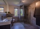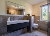 Naast de derde slaapkamer is de in 2023 vernieuwde badkamer. Mooie, grijze tegels zijn gecombineerd met stucwerk en ook hier zorgt een raam voor lichtinval. De inloopdouche is van groot formaat en verder zijn er een wandcloset en een extra brede wastafel met twee kranen. De lade en de hoge kast bieden ruimte om handdoeken en andere spullen op te bergen.