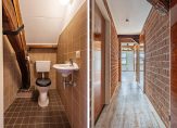De hal met groepenkast is een grote ruimte, die toegang biedt tot de woonkamer, slaapkamer, badkamer en toiletruimte. We gaan eerst naar de woonkamer, met grote ramen aan de Rodetorenstraat en de Lange Hofstraat. Bewonder de prachtige dakconstructie en de balken, om vervolgens te bedenken hoe je de ruimte gaat inrichten. In de halfopen keuken, met dakraam en inbouwkast, staat een eenvoudige hoekopstelling met een gaskookplaat. De keuken is naar jouw eigen wens en invulling aan te passen.