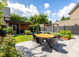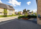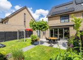 Openslaande deuren geven toegang tot de fraai aangelegde achtertuin op het westen. Het terras is van groot formaat en de veranda is de plek om te barbecueën. Verder zie je veel groen in de tuin, wat de kinderen gebruiken om buiten te spelen. Naast de garage is een eigen achterom, afgesloten met een poort, die leidt naar de oprit voor twee auto’s. De voortuin, met een cortenstaal plantenbak en gevarieerd groen, maakt het plaatje meer dan compleet…