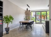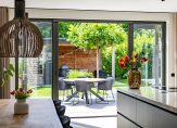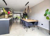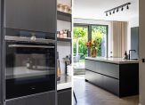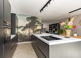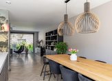 De woonkeuken, met openslaande deuren naar de achtertuin, is een plek waar een groot deel van het dagelijkse leven plaatsvindt. Koken, eten, bezoek ontvangen, huiswerk maken en een spelletje spelen… hier kan het allemaal. De keukenopstelling met een hoge kastenwand, koffiecorner en een groot eiland is perfect voor de kook- en bakliefhebber. Aan bergruimte is geen gebrek en de inductie kookplaat met afzuiging, Quooker, vaatwasser, oven, combimagnetron, koelkast en vriezer zijn ingebouwd.