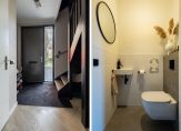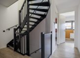 Dit is een huis om verliefd op te worden! Aan het einde van de oprit, aan de linkerzijde, is de entree van dit prachtige huis. In de hal ligt, net als op bijna de hele begane grond, een visgraat pvc-vloer met vloerverwarming en de trap is de blikvanger. Links in de hal is de fraaie toiletruimte en aan de rechterzijde, onder de trap, vind je de garderobe.