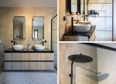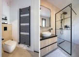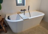 De stijlvolle en chique badkamer heeft niet alleen een ruime inloopdouche, maar ook een heerlijk bad. Verder zijn er een tweede toilet en een breed badmeubel, waarop twee ronde wastafels staan. Alles klopt: van de spiegel tot de zwarte kranen en de douchewand. Wow!