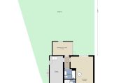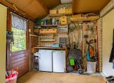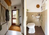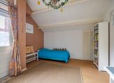 De slaapkamer is aan de achterzijde, met mooi uitzicht naar de tuin. Deze kamer is groot genoeg om in te richten als tweepersoonskamer. Ga je toch boven slapen? Dan is deze kamer onder andere geschikt als werkkamer, hobbyruimte of atelier. De badkamer, achter de klapdeurtjes, is ingedeeld met een ligbad/douche, een wastafelmeubel en een toilet.
