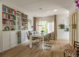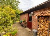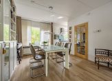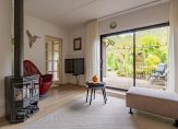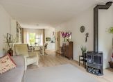 Wat een leuke ruimte is de woon-/eetkamer, met een grote schuifpui naar de tuin en een houtkachel bij het zitgedeelte. Aan de achterzijde is het zitgedeelte maar liefst 4.60 meter breed, en het eetgedeelte is perfect om een 6-persoonstafel neer te zetten. Ook hier heb je mooi uitzicht, naar het vele groen in de voortuin.