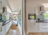 Vanaf het eetgedeelte loop je de keuken in, die in 2015 is vernieuwd. De ruimte is optimaal benut, met een hoekopstelling en een hoge kastenwand. Het blad van natuursteen is in een mooie bruine kleur, en alle benodigde apparatuur is ingebouwd: een keramische kookplaat, afzuigkap, combi-oven, koelkast en een vaatwasser (circa 2019).