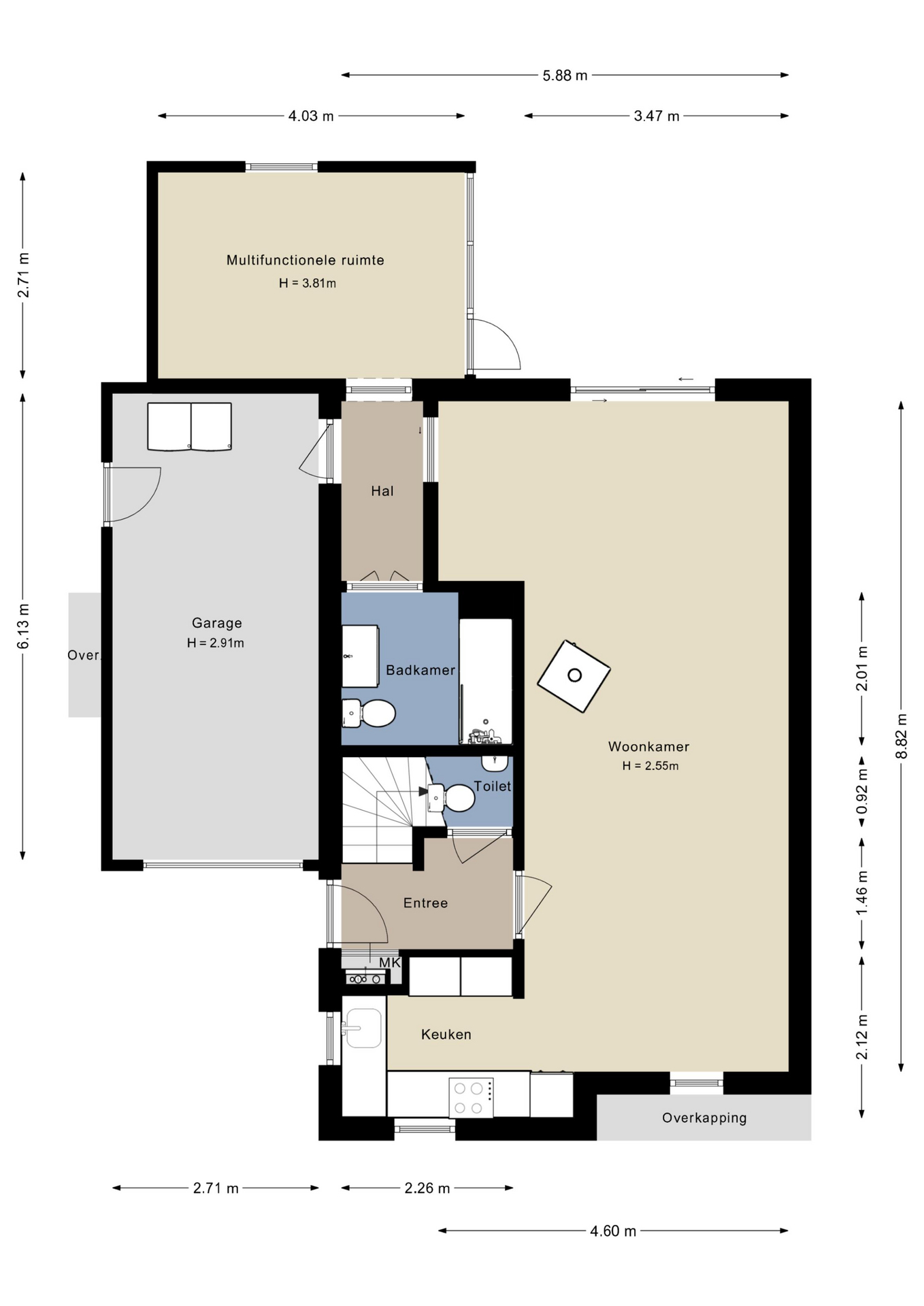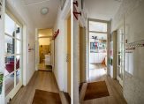 Staat de auto op de oprit? Dan is het maar een paar stappen naar de entree van deze verrassend ruime woning. In de hal zijn de meterkast en de trap naar de eerste verdieping. Onder deze trap is de toiletruimte, met deels betegelde wanden en een fonteintje.