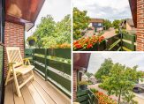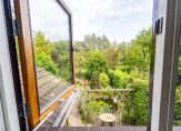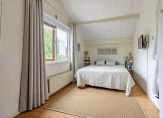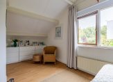 Kenmerkend voor deze verdieping is het schuine dak, met zicht tot in de nok. Dit zie je vooral op de overloop en in de slaapkamers, die beiden over de hele breedte van het huis zijn. De slaapkamer aan de voorzijde, met afgesloten opbergruimte en een balkon, is in gebruik als logeer-/hobbyruimte, en de kamer aan de achterzijde als master bedroom. En dat is, vanwege het uitzicht, heel logisch.