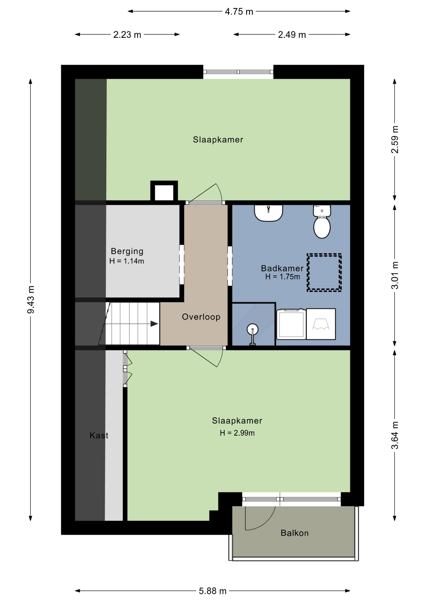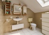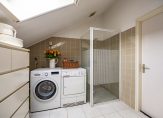De badkamer op deze verdieping is uitgevoerd in dezelfde stijl als de badkamer beneden. Hier zorgt een royaal dakraam voor lichtinval, en de ruimte is ingedeeld met een douche, toilet en wastafel. Ook de wasmachine en droger kunnen hier staan. Tegenover de badkamer bevindt zich de cv ruimte met opbergmogelijkheid.