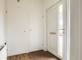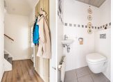 De entree, met een overkapping en een kunststof voordeur, is je eerste kennismaking met deze ruime woning. In de hal zie je de trapopgang, een handige trapkast, de meterkast en de toiletruimte met fonteintje. De mooie pvc vloer ligt niet alleen in de hal, maar op bijna de hele begane grond.