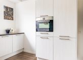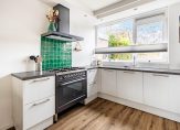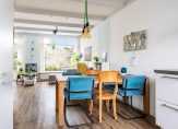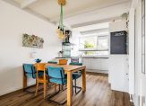 Er is een open verbinding met de keuken, waar genoeg plek is om een grote eettafel neer te zetten. In de keuken staat een lichte hoekopstelling (2017), met groene wandtegels bij het kookgedeelte en een aparte hoge kastenwand. Alle benodigde apparatuur is aanwezig: een Boretti gasfornuis met oven, een afzuigkap, vaatwasser, combi-oven, koelkast en een vriezer.