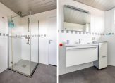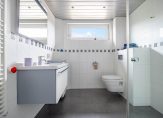 De ruime badkamer (2006), uitgevoerd in wit en grijs, is ingedeeld met een inloopdouche, wastafelmeubel en een wandcloset. Het verlaagde plafond is voorzien van inbouwverlichting en naast de wastafel hangt een hoge handdoekenradiator.