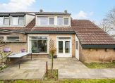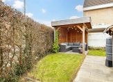 Een deel van de voortuin is gebruikt om extra parkeergelegenheid op eigen terrein te creëren. Links van de garage is een poort, die leidt naar de zij- en achtertuin. De brede achtertuin, met een groot terras en veel groen, is gesitueerd op het zonnige zuiden. Aan de straatkant staat een hoge haag en het overdekte terras is een heerlijke plek om buiten te zitten.
