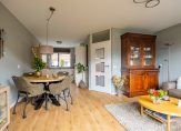Niet alleen in de hal, maar ook in de woonkamer en keuken ligt laminaat op de vloer. De L-vormige woonkamer is tuingericht, met een airco-unit bij het zitgedeelte en het eetgedeelte vlak naast de open keuken.
