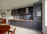 In de keuken staat een donkergrijze wandopstelling met een houten aanrechtblad en een mooie achterwand. De keramische kookplaat, afzuigkap, vaatwasser, combimagnetron en koelkast zijn ingebouwd.