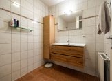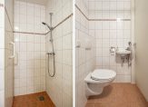 In de badkamer is de ruimte ingedeeld met een inloopdouche en een in 2025 geplaatste wastafel. Lichte wandtegels zijn gecombineerd met vloertegels in een warme kleur, die ook zichtbaar is in de tegelrand. Deze kleuren zie je ook in de naastgelegen toiletruimte.