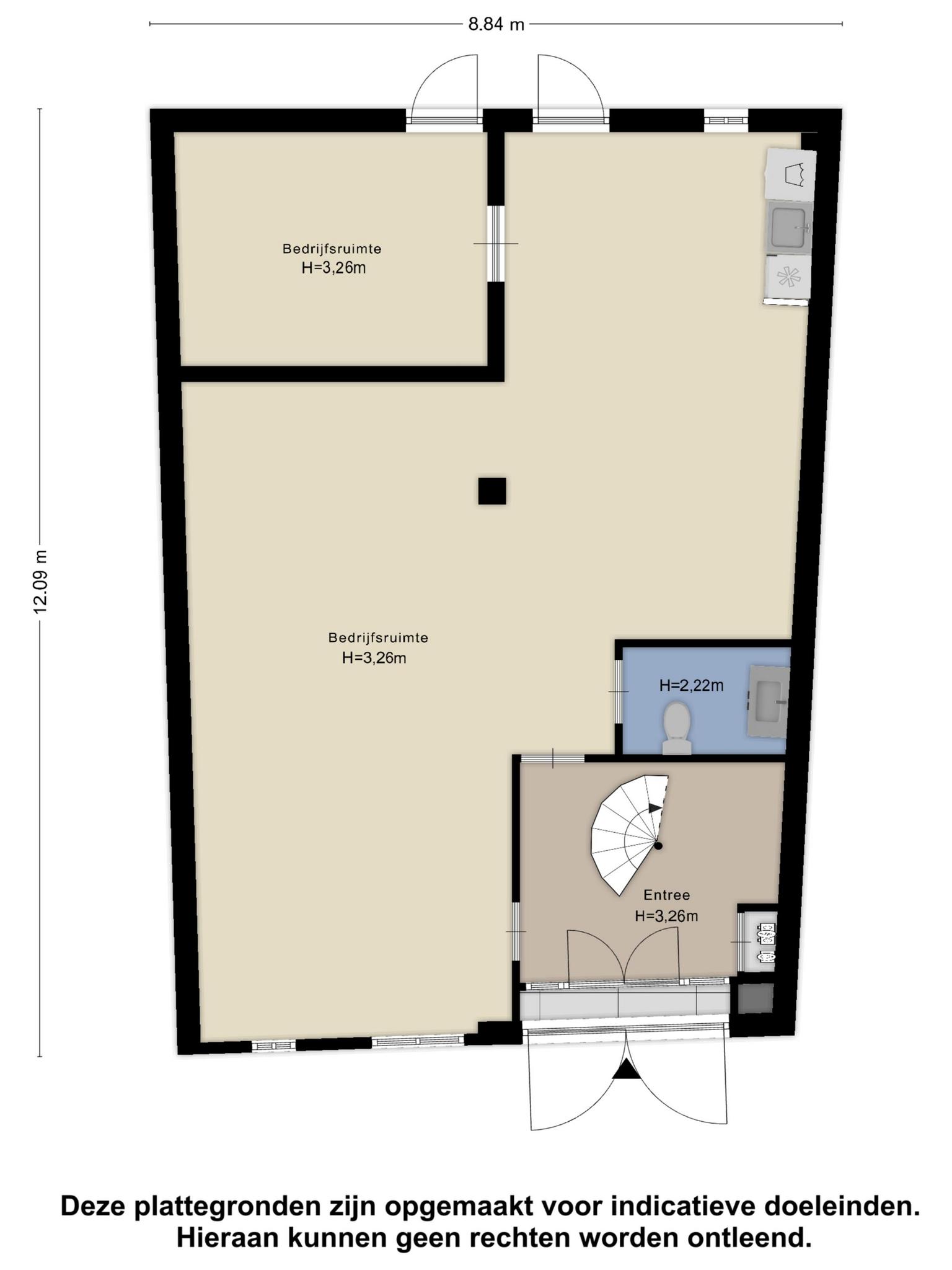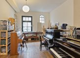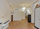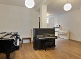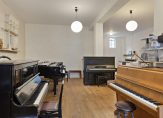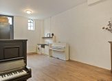 Via een vernieuwde pui met openslaande deuren kom je in een grote, lichte ruimte waar nu meerdere piano’s staan. Het plafond heeft een hoogte van circa 3.26 meter en lichtinval via ramen aan de voor- en achterzijde. Aan de achterzijde is een aparte (werk)ruimte die, net als de grote ruimte, klaar is voor een nieuwe invulling. Verder zijn er op de begane grond een eenvoudig keukenblok en een toiletruimte met wastafelmeubel.