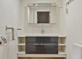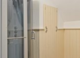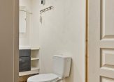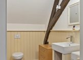 Aan de achterzijde is een L-vormige slaapkamer met een directe toegang tot de badkamer. De badkamer is ingedeeld met een douchecabine, wastafel, toilet en een kast met de HR-ketel. De tweede slaapkamer/werkkamer, met indirect licht via de woonkamer, is aan de voorzijde.