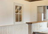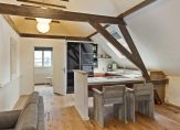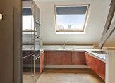 In de woonkamer met open keuken zorgt het raam aan de voorzijde, net als het dakraam, voor lichtinval. Het eetgedeelte maakt deel uit van de keuken in U-opstelling met een ingebouwde kookplaat, koelkast, vriezer en een combi-oven.