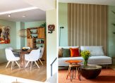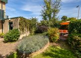 De L-vormige woonkamer heeft een speels niveauverschil, met de royale zitkamer op aan de tuinzijde. Je ziet niet alleen een dubbel raam, maar ook openslaande deuren waardoor veel licht naar binnen valt. Sfeermakers zijn de inbouwhaard, de kleuren op de gestucte muren en de parketvloer.