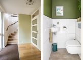 Nooit meer zoeken naar een parkeerplek, want bij deze woning kun je parkeren op eigen terrein. Vlak naast de oprit is de deur naar de bijkeuken, die de bewoners als dagelijkse entree gebruiken. De officiële entree is echter aan de voorzijde, onder het balkon. Achter de voordeur is de hal met de meterkast, trapopgang en de toiletruimte.
