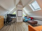 Zijn drie slaapkamers niet genoeg? Op de tweede verdieping zijn nog twee ruime slaapkamers, waarmee het totaal op vijf komt. Beide slaapkamers zijn, net als de overloop, heel licht en er ligt laminaat op de vloer. De kamer aan de voorzijde is ingericht als logeerkamer, en de kamer aan de achterzijde als werkkamer. In deze kamer hangt een airco-unit, net als in de woonkamer.